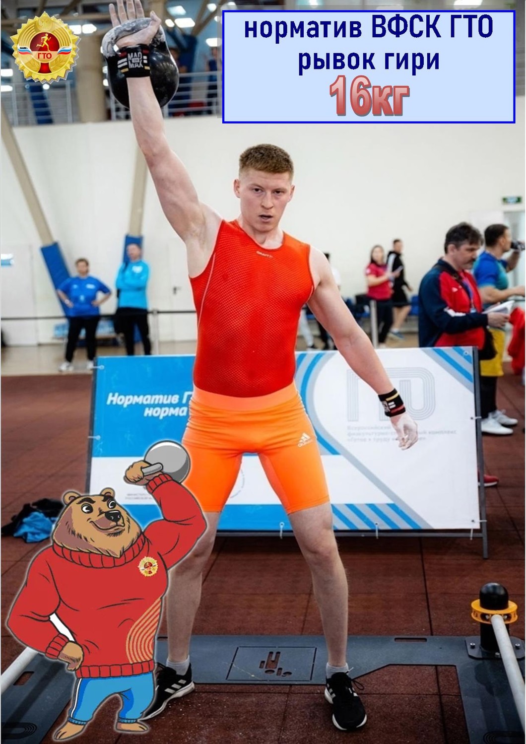 Для выполнения испытания используется гиря весом 16 кг. Контрольное время выполнения упражнения – 4 мин. Засчитывается суммарное количество правильно выполненных рывков гири правой и левой рукой.