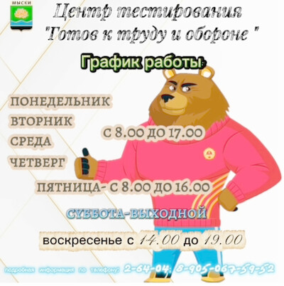 Центр тестирования « Готов к труду и обороне» Мысковского городского округа приглашает всех желающих на выполнение нормативов комплексов ГТО по предварительной записи : 2-64-04, 8-905-067-5952. Адрес: г. Мыски, ул. Энергетиков 4в/1 МАУ МГО СОК « Олимпиец», 1 этаж, кабинет № 105 E-mail: gto_myski@mail.ru |